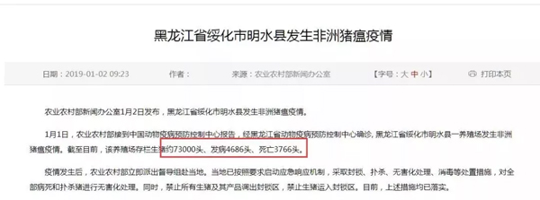 就在大家以為疫情趨緩之時,元旦過后第一天,2019年1月2日上午9點半,農(nóng)業(yè)部發(fā)布了黑龍江省綏化市明水縣發(fā)生非洲豬瘟疫情,該養(yǎng)殖場存欄生豬約73000頭、發(fā)病4686頭、死亡3766頭。
