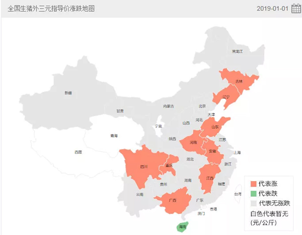 △豬e網(wǎng)統(tǒng)計的2019年1月1日全國生豬外三元指導價漲跌地圖