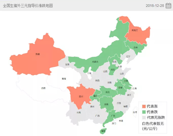 △豬e網(wǎng)統(tǒng)計的2018年12月28日全國生豬外三元指導價漲跌地圖