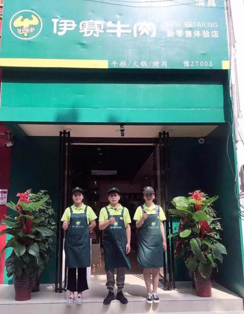 2019年5月18日,標號豫ZT003號的伊賽牛肉直營新零售體驗店三號店正式開業。綠色主題招牌下記錄著三個關鍵詞:牛排/火鍋/烤肉。
