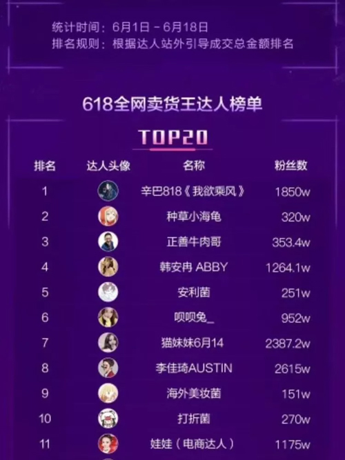 從618根據GMV(網站成交金額)排名的全網賣貨王達人榜單上可以看出,電商平臺上,粉絲量與銷售能力并不完全成正比。