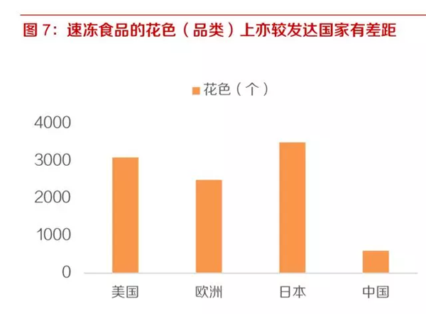 速凍食品的花色(品類)上,美、歐、日均保持在2500種以上,而我國(guó)僅600 種,較發(fā)達(dá)國(guó)家亦有差距。