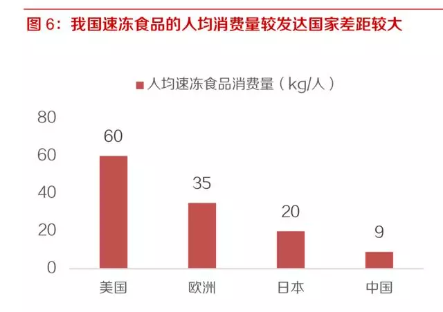 人均消費(fèi)量上,美國(guó)速凍食品人均消費(fèi)量達(dá)到60kg/年,歐洲35kg/年,日本也達(dá) 到了 20kg/年,但相比之下我國(guó)的人均消費(fèi)量?jī)H為9kg/年,較發(fā)達(dá)國(guó)家的差距較大;