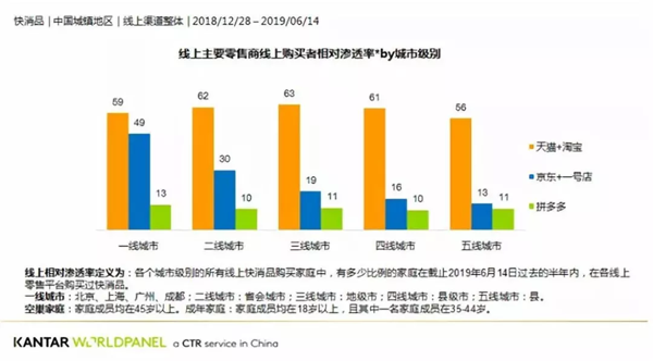 據凱度消費者指數消息,就快消品的線上購買者滲透率而言,在截止2019年6月過去的半年期間,一線城市(北京、上海、廣州、成都)中已有13%的家庭在拼多多購買過快消品,這個數字高于拼多多在二至五線城市的線上購買者相對滲透率。