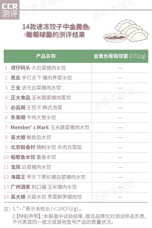 檢測結果顯示,14款速凍餃子均未檢出金黃色葡萄球菌(<10CFU/g),說明這些速凍餃子從原料自然帶入或生產、流通過程中都不存在污染金黃色葡萄球菌的風險。