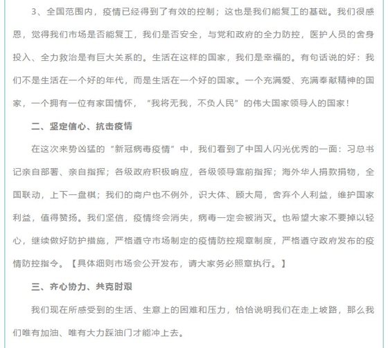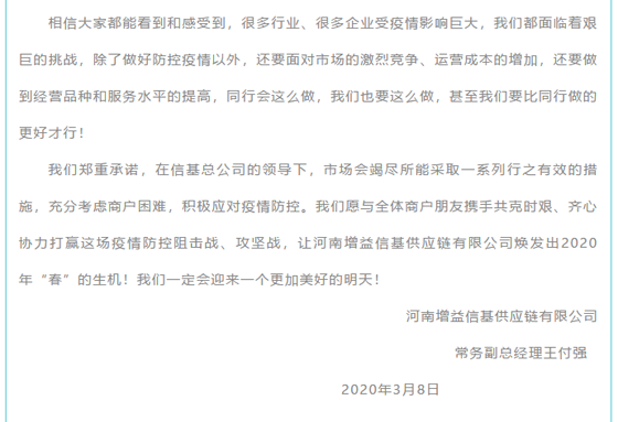 3月8日下午,河南增益信基供應(yīng)鏈有限公司官微發(fā)布《致商戶朋友的一封公開信》。文中表示,在信基總公司的領(lǐng)導(dǎo)下,市場將分批開門營業(yè):