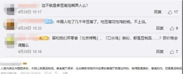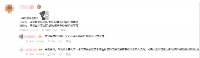 在B站、微博、微信上,“人造肉”相關(guān)內(nèi)容的評(píng)論欄中,消費(fèi)者對(duì)其詬病主要集中在三個(gè)部分:價(jià)格貴、口感差、沒肉味。而這實(shí)際上也是目前阻礙中國(guó)“人造肉”企業(yè)發(fā)展、并且各個(gè)企業(yè)和研發(fā)機(jī)構(gòu)在攻克的三個(gè)維度。