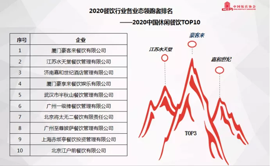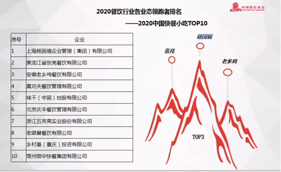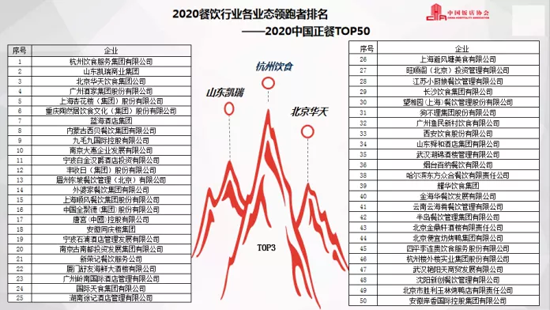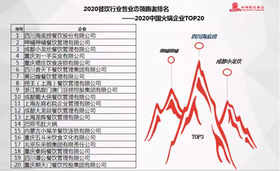 報告顯示,在2020餐飲行業各業態領跑者排名(2019財年)中,正餐前3名品牌分別為,杭州飲食服務集團有限公司、山東凱瑞商業集團、北京華天飲食集團公司;海底撈、呷哺呷哺、小龍坎為火鍋類排名前3名的企業;快餐小吃前3名品牌為楊國福、張亮和老鄉雞;休閑餐前3名為豪客來、水天堂和嘉和世紀。