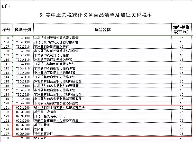 作為回應,經中國國務院批準,國務院關稅稅則委員會決定自2018年4月2日起,對原產于美國的7類128項進口商品中止關稅減讓義務,在現行的適用關稅稅率基礎上加征關稅,其中美國豬肉各類產品赫然在列。