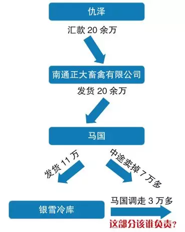 馬國出逃后,仇澤找正大食品(南通)有限公司商量解決方案,最后不得不先接受該公司的提議:正大食品(南通)有限公司以每噸貨少收2000元的方式,先將馬國私挪的貨款7萬多元補齊。但馬國私自將仇澤代儲在銀雪冷庫價值1萬多元的貨調出賣掉一事,公司不予承認;對于馬國在分銷過程中將1萬多元的貨款私吞一事,也不予賠償。在正大食品(南通)有限公司看來,這都是馬國的個人行為,與公司無關,同時希望和仇澤通過法律途徑解決。