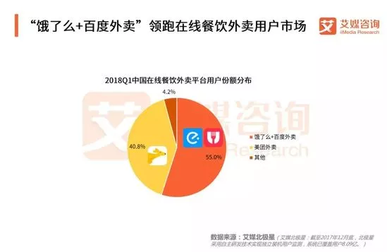 iiMedia Research(艾媒咨詢)數據顯示,在2018年第一季度,餓了么與百度外賣仍占優勢,市場用戶份額占比達55.0%,美團外賣占比40.8%緊隨其后,市場格局兩家獨大。