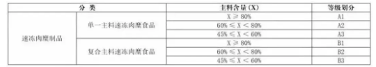 根據上述標準,速凍肉糜制品首先分為單一主料速凍肉糜食品和復合主料速凍肉糜食品,再根據速凍肉糜食品中的主料含量,將其各劃分為三級,1級至3級表示主料含量逐漸降低。
