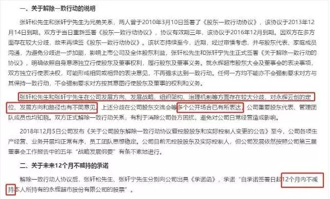 公告表示,張軒松和張軒寧在公司發(fā)展方向、發(fā)展戰(zhàn)略、組織架構(gòu)、治理機(jī)制等方面存在較大分歧,對(duì)永輝云創(chuàng)(超級(jí)物種)的定位、發(fā)展方向和路徑也有不同意見(jiàn)。為避免分歧進(jìn)一步加劇,影響上市公司及全體股東利益,張軒松先生和張軒寧先生正式簽署《關(guān)于解除一致行動(dòng)的協(xié)議》。