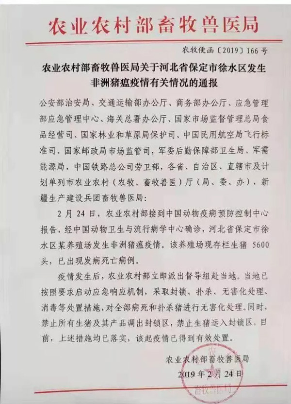 昨日,農業農村部發布公告,稱河北省保定市徐水區某養殖場發生非洲豬瘟疫情。該養殖場現存欄生豬5600頭,已出現發病死亡病例。這是河北首次被報道發生非洲豬瘟疫情,