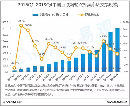另一方面,外賣的爆發,也對快速響應的凍品食材需求不斷加大。根據易觀智庫監測,2018年四季度,我國外賣整體交易規模達到1406億元,自2016年以來,一直保持著100%以上的單季增速。