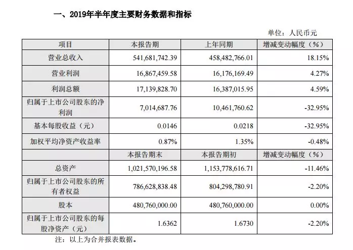 公告顯示,公司2019年1-6月實現營業收入5.42億元,同比增長18.15%;歸屬于上市公司股東的凈利潤701.47萬元,同比下降32.95%。