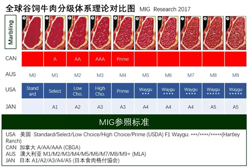 最后,由于分級體系的不同,我們一起橫向梳理一下全球谷飼牛肉分級體系的對應關系:
