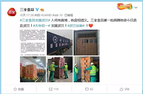 昨日,三全食品表示,該公司向武漢捐贈的首批物資于當日奔赴武漢。下午16點,該批物資啟程運輸,預計當天晚上會抵達武漢。