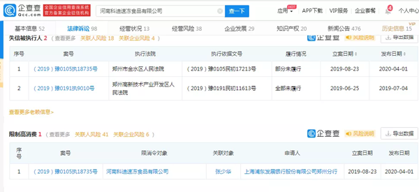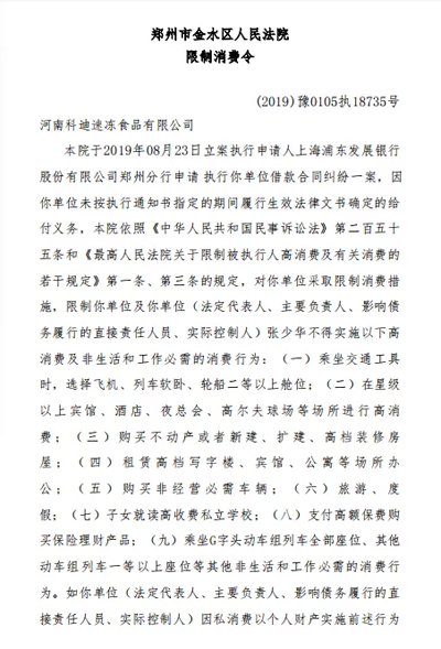 據(jù)企查查網(wǎng)站顯示,4月1日,科迪速凍被鄭州市金水區(qū)人民法院列為失信被執(zhí)行人,并對(duì)其發(fā)布了《限制高消費(fèi)》。不僅如此,2019年7月4日,科迪速凍還曾被鄭州新高技術(shù)產(chǎn)業(yè)開(kāi)發(fā)區(qū)人民法院列為失信被執(zhí)行人。